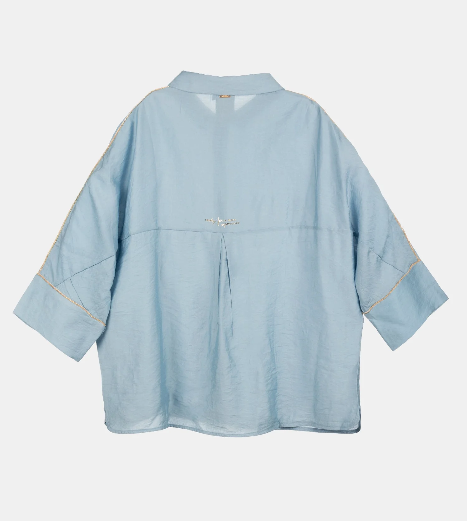 Elle est bleue, avec des manches courtes et une fermeture à boutons. Lorsque vous la portez, stylisez-la comme vous le souhaitez ! Vous pouvez la porter ample, en surchemise, avec un pantalon ou une jupe... Une myriade de possibilités pour en dire un peu plus sur vous au monde.